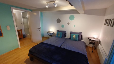 La chambre dispose d'un lit 2 personnes et de la possibilité de placer un lit de bébé (disponible sur place).